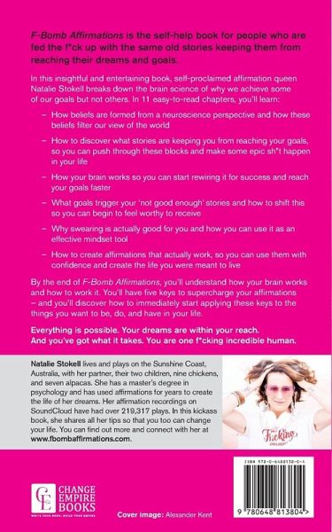 F-Bomb Affirmations is the self-help book for people who are fed the f•ck up with the same old stories keeping them from reaching their dreams and goals. In this insightful and entertaining book, self-proclaimed affirmation queen Natalie Stokell breaks down the brain science of why we achieve some of our goals but not others. In 11 easy-to-read chapters, you’ll learn: How beliefs are formed from a neuroscience perspective and how these beliefs filter our view of the world How to discover what stories are keeping you from reaching your goals, so you can push through these blocks and make some epic sh•t happen in your life. How your brain works so you can start rewiring it for success and reach your goals faster. Why swearing is actually good for you and how you can use it as an effective mindset tool. How to create affirmations that actually work, so you can use them with confidence and create the life you were meant to live By the end of F-Bomb Affirmations, you’ll understand how your brain works and how to work it. You’ll have five keys to supercharge your affirmations – and you’ll discover how to immediately start applying these keys to the things you want to be, do, and have in your life. Everything is possible. Your dreams are within your reach. And you’ve got what it takes. You are one f•cking incredible human.