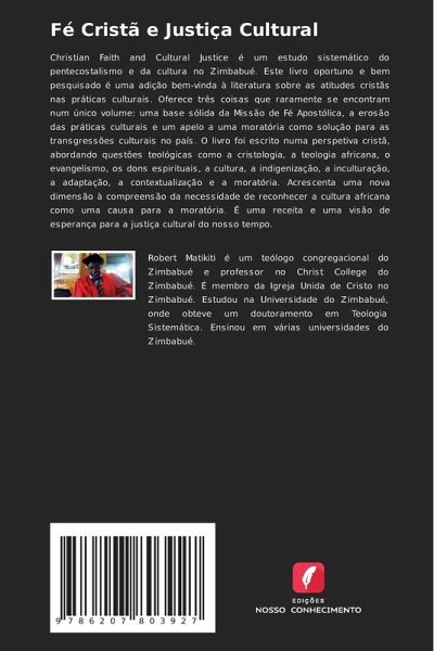 Christian Faith and Cultural Justice é um estudo sistemático do pentecostalismo e da cultura no Zimbabué. Este livro oportuno e bem pesquisado é uma adição bem-vinda à literatura sobre as atitudes cristãs nas práticas culturais. Oferece três coisas que raramente se encontram num único volume: uma base sólida da Missão de Fé Apostólica, a erosão das práticas culturais e um apelo a uma moratória como solução para as transgressões culturais no país. O livro foi escrito numa perspetiva cristã, abordando questões teológicas como a cristologia, a teologia africana, o evangelismo, os dons espirituais, a cultura, a indigenização, a inculturação, a adaptação, a contextualização e a moratória. Acrescenta uma nova dimensão à compreensão da necessidade de reconhecer a cultura africana como uma causa para a moratória. É uma receita e uma visão de esperança para a justiça cultural do nosso tempo.