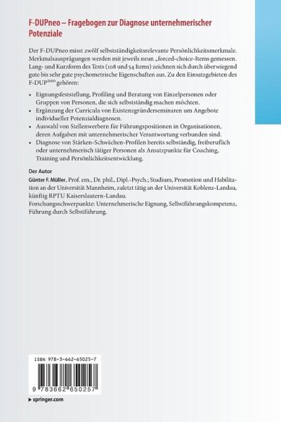 Die Langform des F-DUPNeo besteht aus zwölf Subtests und 108 Items. Sie ermöglicht eine breite und umfassende Diagnose unternehmerischer Eigenschaftspotenziale. Das Profil von Testwerten einzelner Eigenschaften lässt individuelle Stärken und Schwächen erkennen. Zudem kann aus den Messwerten der sechs differenzierungsfähigsten Subtests die Größe des unternehmerischen Gesamtpotenzials er-mittelt werden.