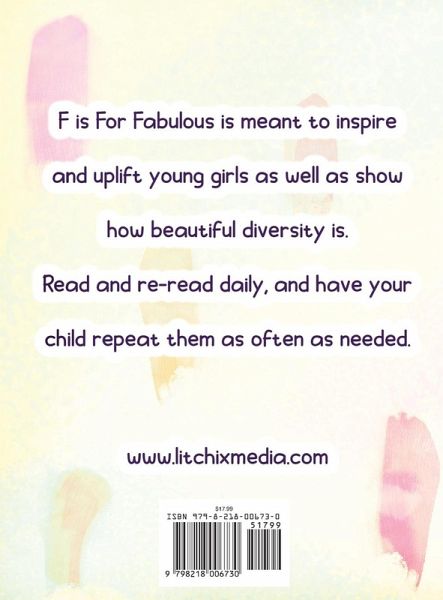 F is For Fabulous is meant to inspire and uplift young girls as well as show how beautiful diversity is. Read and re-read affirmations daily and have your fabulous person repeat them as often as needed.