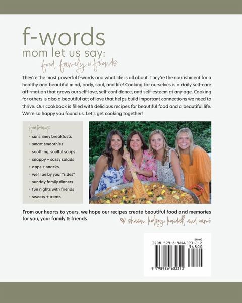 Inspirational author Sharon Caldwell Peddie and her 3 adult daughters: Kelsey (a lawyer); Kendall (a registered dietitian); and Cami (a college student in strategic communications) believe food, family & friends are the most beautiful, meaningful, and nourishing f-words. Their cookbook was created during the Covid-19 pandemic and is a celebration of positivity, resiliency, and creating a beautiful life no matter what life throws at us. Being together, cooking, creating, and writing their cookbook has been the women's pandemic silver lining. Putting their recipes, experiences, values, philosophies, and memories in writing has felt very powerful to them. It's their positive, productive punch at Covid-19 and kind of a metaphoric f*** you. "f-words mom let us say" is filled with approachable and inspirational recipes for: sunshiney breakfasts; smart smoothies; soothing, soulful soups; snappy salads; apps + snacks; sides; sunday family dinners; fun nights with friends; and sweets + treats.They believe in whole-body health. This powerful mother/daughters team believes food is nourishment for the mind, body, and soul and that all foods should be enjoyed without a side of guilt. They hope their recipes will boost overall wellbeing and inspire more cooking for yourself and for others too. They've added some "extra love" in this warm, informative cookbook. Look for Tradition, Complete Meal and Plant-Forward "stickers" on recipes--they indicate a little something extra and special for you. Adding even more love and inspiration to the stickers is space for note-taking. Sharon is also the Author of "Grow Yourself Beautiful: A Smart Girl's Guide to Following Her Heart and Focusing on Her Inner Joy". Being a mom of 3 daughters, it's been her passion and mission to raise confident women with a strong sense of self in today's challenging world. She believes there are many roads to help build that, and they traveled many of them-from academics, sports, arts, community service, and more. But one of her biggest surprises was seeing how learning to cook proved to be such a powerful road to developing self-love and confidence. They want to share that experience to help others. The girls grew up in the kitchen with Sharon. They loved creating family meals together, and love a kitchen or backyard full of friends! Hosting dance team celebrations, soccer and volleyball team sleepovers, and backyard dinner parties was a way of life. They've developed traditions around food that have become the fabric of their lives-and their friends' lives too. Food, family & friends are the most beautiful and meaningful F words. They are the words that life is all about!