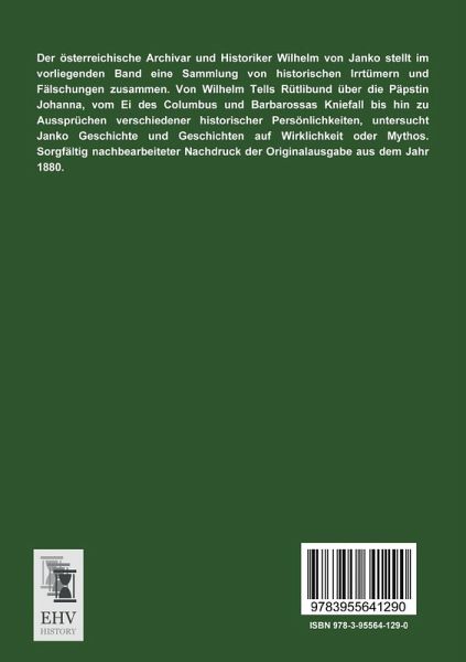 Der österreichische Archivar und Historiker Wilhelm von Janko stellt im vorliegenden Band eine Sammlung von historischen Irrtümern und Fälschungen zusammen. Von Wilhelm Tells Rütlibund über die Päpstin Johanna, vom Ei des Columbus und Barbarossas Kniefall bis hin zu Aussprüchen verschiedener historischer Persönlichkeiten, untersucht Janko Geschichte und Geschichten auf Wirklichkeit oder Mythos. Sorgfältig nachbearbeiteter Nachdruck der Originalausgabe aus dem Jahr 1880.