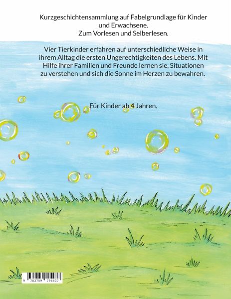 Kurzgeschichtensammlung auf Fabelgrundlage für Kinder und Erwachsene. Zum Vorlesen und Selberlesen. Vier Tierkinder erfahren auf unterschiedliche Weise in ihrem Alltag die ersten Ungerechtigkeiten des Lebens. Mit Hilfe ihrer Familien und Freunde lernen sie, Situationen zu verstehen und sich die Sonne im Herzen zu bewahren. Für Kinder ab 4 Jahren.