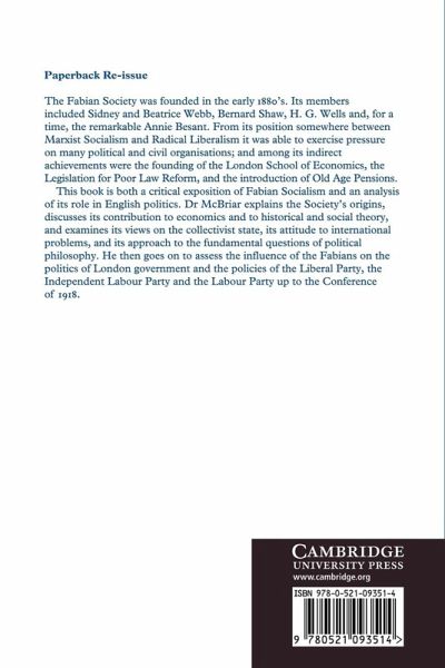 The Fabian Society was founded in the early 1880s. Its members included Sidney and Beatrice Webb. Bernard Shaw, H. G. Wells and, for a time, the remarkable Annie Besant. From its position somewhere between Marxist socialism and Radical Liberalism it was able to exercise pressure on many political organisations and among its indirect achievements were the founding of the London School of economics, the Legislation for Poor Law Reform, and the introduction of Old Age Pensions. This book is both a critical exposition of Fabian Socialism and an analysis of its role in English politics. Dr McBriar explains the Society's origins, discusses its contribution to economics and to historical and social theory, and examines its views on the collectivist state, its attitude to international problems, and its approach to the fundamental questions of political philosophy. He then goes on to assess the influence of the Fabians on the politics of London government and the policies of the Liberal party, the Independent Labour Party and the Labour Party up to the conference of 1918.