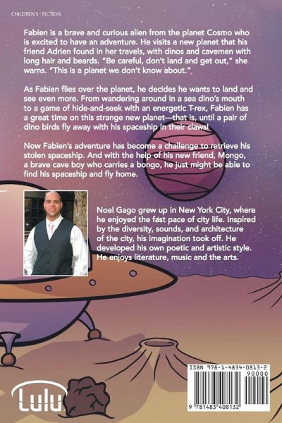 Fabien is a brave and curious alien from the planet Cosmo who is excited to have an adventure. He visits a new planet that his friend Adrien found in her travels, with dinos and cavemen with long hair and beards. "Be careful, don't land and get out," she warns. "This is a planet we don't know about." As Fabien flies over the planet, he decides he wants to land and see even more. From wandering around in a sea dino's mouth to a game of hide-and-seek with an energetic T-rex, Fabien has a great time on this strange new planet-that is, until a pair of dino birds fly away with his spaceship in their claws! Now Fabien's adventure has become a challenge to retrieve his stolen spaceship. And with the help of his new friend, Mongo, a brave cave boy who carries a bongo, he just might be able to find his spaceship and fly home.