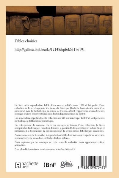 Fables choisies Date de l'édition originale: 1849 Le présent ouvrage s'inscrit dans une politique de conservation patrimoniale des ouvrages de la littérature Française mise en place avec la BNF. HACHETTE LIVRE et la BNF proposent ainsi un catalogue de titres indisponibles, la BNF ayant numérisé ces oeuvres et HACHETTE LIVRE les imprimant à la demande. Certains de ces ouvrages reflètent des courants de pensée caractéristiques de leur époque, mais qui seraient aujourd'hui jugés condamnables. Ils n'en appartiennent pas moins à l'histoire des idées en France et sont susceptibles de présenter un intérêt scientifique ou historique. Le sens de notre démarche éditoriale consiste ainsi à permettre l'accès à ces oeuvres sans pour autant que nous en cautionnions en aucune façon le contenu. Pour plus d'informations, rendez-vous sur www.hachettebnf.fr