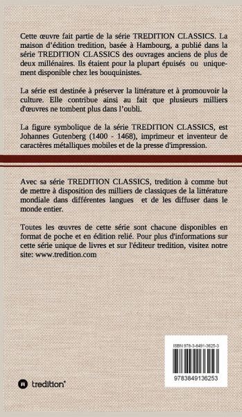 Cette uvre (édition relié) fait partie de la série TREDITION CLASSICS. La maison d édition tredition, basée à Hambourg, a publié dans la série TREDITION CLASSICS des ouvrages anciens de plus de deux millénaires. Ils étaient pour la plupart épuisés ou uniquement disponible chez les bouquinistes. La série est destinée à préserver la littérature et à promouvoir la culture. Avec sa série TREDITION CLASSICS, tredition à comme but de mettre à disposition des milliers de classiques de la littérature mondiale dans différentes langues et de les diffuser dans le monde entier.