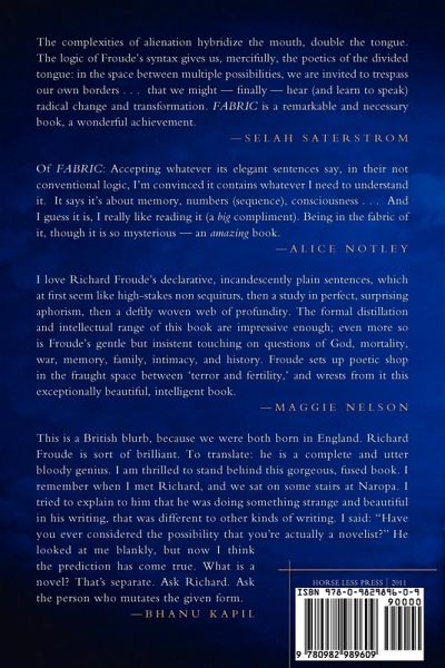 "I love Richard Froude's declarative, incandescently plain sentences, which at first seem like high-stakes non sequiturs, then a study in perfect, surprising aphorism, then a deftly woven web of profundity. The formal distillation and intellectual range of this book are impressive enough; even more so is Froude's gentle but insistent touching on questions of God, mortality, war, memory, family, intimacy, and history. Froude sets up poetic shop in the fraught space between 'terror and fertility,' and wrests from it this exceptionally beautiful, intelligent book." -Maggie Nelson