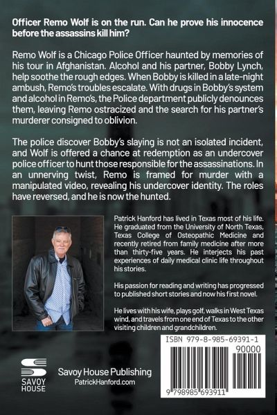 Officer Remo Wolf is on the run. Can he prove his innocence before the assassins kill him? Remo Wolf is a Chicago Police Officer haunted by memories of his tour in Afghanistan. Alcohol and his partner, Bobby Lynch, help soothe the rough edges. When Bobby is killed in a late-night ambush, Remo's troubles escalate. With drugs in Bobby's system and alcohol in Remo's, the Police department publicly denounces them, leaving Remo ostracized and the search for his partner's murderer consigned to oblivion. When the police discover Bobby's slaying is not an isolated incident, Remo is offered a chance at redemption as an undercover police officer and hunt those responsible for the assassinations. In an unnerving twist, Remo is framed for murder with a manipulated video, revealing his undercover identity. The roles have reversed, and he is now the hunted. Maggie McCall is an ambitious Assistant State's Attorney while hiding a romantic relationship with Remo Wolf from the public. Can she turn against him? A high-profile case capturing and convicting Wolf can propel her to the next level of her career. On the run, Wolf must outwit the police, his paramour, the State's Attorney's office, and the assassins while searching for the only thing that can prove his innocence – the unmanipulated video.