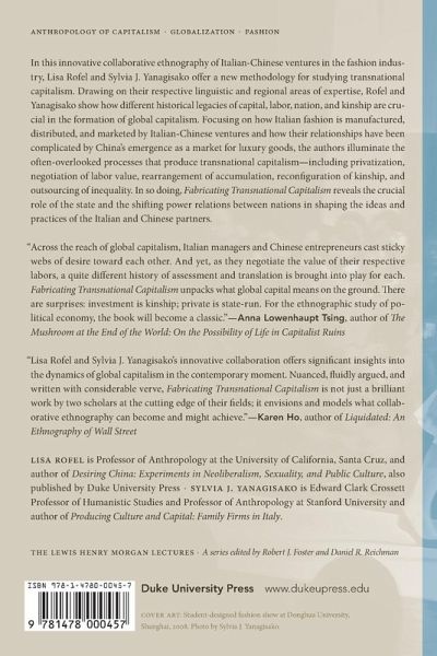 In this innovative collaborative ethnography of Italian-Chinese ventures in the fashion industry, Lisa Rofel and Sylvia J. Yanagisako offer a new methodology for studying transnational capitalism. Drawing on their respective linguistic and regional areas of expertise, Rofel and Yanagisako show how different historical legacies of capital, labor, nation, and kinship are crucial in the formation of global capitalism. Focusing on how Italian fashion is manufactured, distributed, and marketed by Italian-Chinese ventures and how their relationships have been complicated by China's emergence as a market for luxury goods, the authors illuminate the often-overlooked processes that produce transnational capitalism-including privatization, negotiation of labor value, rearrangement of accumulation, reconfiguration of kinship, and outsourcing of inequality. In so doing, Fabricating Transnational Capitalism reveals the crucial role of the state and the shifting power relations between nations in shaping the ideas and practices of the Italian and Chinese partners.
