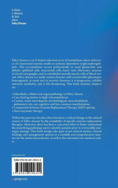 Fabry disease is an X-linked inborn error of metabolism wherein deficiency of a lysosomal enzyme results in systemic deposition of glycosphingolipids. Storage deposition, and hence pathological disease, occurs preferentially in renal glomerular and tubular epithelial cells, myocardial cells, heart valve fibrocytes, neurons of dorsal root ganglia, and in endothelial smooth muscle cells of blood vessels. Thus, Fabry disease is a multi-system disorder, albeit with considerable phenotypic heterogeneity in onset and in severity; however, it is progressive, exhibits extensive morbidity, and is life-threatening. Within the past two decades, there has been a radical change in the natural course Fabry disease by virtue of the availability of specific enzyme replacement therapy. Moreover, there has been a concerted effort to better understand the underlying pathology and equally to identify patients prior to the onset of irreversible end-organ damage. It is to be hoped that the future for patients with Fabry disease can be viewed with greater, albeit guarded, optimism. This state-of-the-art textbook attempts to bridge the span of pre-clinical studies, clinical finding, and management options in a readable but comprehensive manner for the medical practitioner as well as the interested non-medical reader.