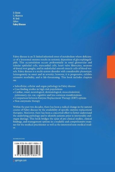 Fabry disease is an X-linked inborn error of metabolism wherein deficiency of a lysosomal enzyme results in systemic deposition of glycosphingolipids. Storage deposition, and hence pathological disease, occurs preferentially in renal glomerular and tubular epithelial cells, myocardial cells, heart valve fibrocytes, neurons of dorsal root ganglia, and in endothelial smooth muscle cells of blood vessels. Thus, Fabry disease is a multi-system disorder, albeit with considerable phenotypic heterogeneity in onset and in severity; however, it is progressive, exhibits extensive morbidity, and is life-threatening. Within the past two decades, there has been a radical change in the natural course Fabry disease by virtue of the availability of specific enzyme replacement therapy. Moreover, there has been a concerted effort to better understand the underlying pathology and equally to identify patients prior to the onset of irreversible end-organ damage. It is to be hoped that the future for patients with Fabry disease can be viewed with greater, albeit guarded, optimism. This state-of-the-art textbook attempts to bridge the span of pre-clinical studies, clinical finding, and management options in a readable but comprehensive manner for the medical practitioner as well as the interested non-medical reader.