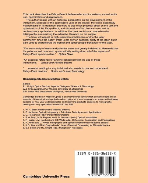 This book describes the Fabry-Perot interferometer and its variants as well as its use, optimisation and applications. The author begins with an historical perspective on the development of the instrument. Because of the quantitative uses of the device, the text tends to be mostly mathematical in its treatment. However, there is also much practical detail on the use and optimization of the Fabry-Perot interferometer and discussion of its classical uses (such as in metrology) and its contemporary applications (such as in lasers). In addition the book contains a comprehensive bibliography summarizing the extensive literature on the subject. This book will appeal both to high-resolution practitioners, such as spectroscopists, and to the laser community, since the Fabrv-Perot is not only an integral part of the laser but is also usea to characterize its optical and spectroscopic behaviour.