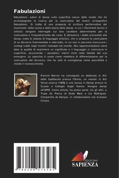 Fabulations: azioni di danza sulla superficie nasce dallo studio che ha accompagnato la ricerca per la costruzione del lavoro coreografico Fabulations. Si tratta di una proposta di scrittura performativa dei movimenti, della scena e della teoria della danza, in cui i riferimenti tecnici e stilistici vengono interrogati sul loro carattere determinante per la costruzione e l'inquadramento dei corpi. È attraverso i dubbi presentati alla danza, sotto lo statuto di linguaggio artistico, che si propone la costruzione di un discorso frammentato e interrotto, in cui non si possono trascurare i contagi subiti negli incontri realizzati nel mondo. Alla rappresentazione viene data la qualità di esprimere un significato e il linguaggio si costruisce in superficie, assumendo i paradossi interni insiti nella fatalità del suo emergere. Lo specchio è usato come metafora di differenziazione per la costruzione del discorso, che ha solo la somiglianza come possibilità e chiede il riconoscimento.