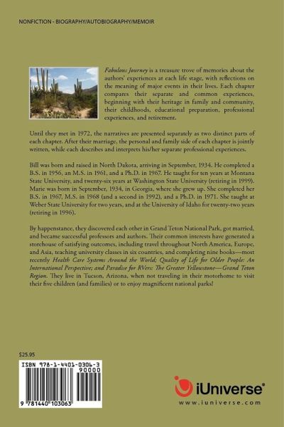 Fabulous Journey is a treasure trove of memories about the authors' experiences at each life stage, with reflections on the meaning of major events in their lives. Each chapter compares their separate and common experiences, beginning with their heritage in family and community, their childhoods, educational preparation, professional experiences, and retirement. Until they met in 1972, the narratives are presented separately as two distinct parts of each chapter. After their marriage, the personal and family side of each chapter is jointly written, while each describes and interprets his/her separate professional experiences. They were born (in the same month) in 1934 at opposite ends of the country, in North Dakota and Georgia. By happenstance, they discovered each other in Grand Teton National Park, got married, and became successful professors and researchers. Bill was a professor for ten years at Montana State University, and twenty-six years at Washington State University. Marie was a professor at Weber State University for two years, and twenty-two years at the University of Idaho. Their common interests have generated a storehouse of satisfying outcomes, including travel throughout North America, Europe, and Asia, teaching university classes in six countries, and completing nine books-most recently Health Care Systems Around the World; Quality of Life for Older People: An International Perspective; and Paradise for RVers: The Greater Yellowstone-Grand Teton Region. They live in Tucson, Arizona, when not traveling in their motorhome to visit their five children (and families), or to enjoy magnificent national parks.