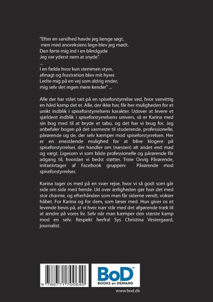 "Efter en sanghed havde jeg længe søgt, men med anoreksiens løgn blev jeg mødt. Den førte mig ind i en blindgyde Jeg var yderst nem at snyde". I en fælde hvor kun stemmen styre, afmagt og frustration blev mit hyrer. Ledte mig på en vej som aldrig ender, mig selv slet ingen mere kender" ... Alle der har stået tæt på en spiseforstyrrelse ved, hvor vanvittig en hård kamp det er. Alle, der ikke har, får her muligheden for et unikt indblik i spiseforstyrrelsens karakter. Udover at levere et sjældent indblik i spiseforstyrrelsens univers, så er Karina med sin bog med til at bryde et tabu, og det har vi brug for. Jeg anbefaler bogen på det varmeste til studerende, professionelle, pårørende og de, der selv kæmper mod spiseforstyrrelsen. "Her er en enestående mulighed for at blive klogere på spiseforstyrrelser, der handler om (næsten) alt andet end mad og vægt. Ligesom vi som både professionelle og pårørende får adgang til, hvordan vi bedst støtter." Trine Oxvig Pårørende, initiativtager af Facebook gruppen: Pårørende mod spiseforstyrrelser. "Karina tager os med på en svær rejse, hvor vi så godt som går side om side med hende. Ud over ærligheden gør hun det med stor charme, og efterhånden som man får siderne vendt, vokser håbet. For Karina og for dem, som læser med. Hun giver os et levende bevis på, at vi hver især står med det afgørende træk til at ændre på vores liv. Selv når man kæmper den største kamp mod en selv. Respekt herfra!" Sys Christina Vestergaard, journalist.