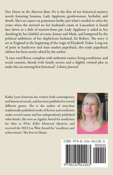 Face Down in the Marrow-Bone Pie is the first of ten historical mystery novels featuring Susanna, Lady Appleton, gentlewoman, herbalist, and sleuth. She's an expert on poisonous herbs, just what's needed to solve the crime when the steward on her husband's estate in Lancashire is found face down in a dish of marrow-bone pie. Lady Appleton is aided in her sleuthing by her faithful servants, Jennet and Mark, and hampered by the political ambitions of her duplicitous husband, Sir Robert. The story is set in England at the beginning of the reign of Elizabeth Tudor. Long out of print in hardcover and mass market paperback, this trade paperback edition has been newly edited by the author. "A nice rural flavor, complete with authentic rustics, living conditions, and social customs, blends with family secrets and a slightly twisted plot to make this an enticing first historical." Library Journal