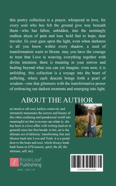 this poetry collection is a prayer, whispered in love, for every soul who has felt the ground give way beneath them-who has fallen, unbidden, into the seemingly endless abyss of pain and loss. hold fast to hope, dear traveler. fix your gaze upon the light, even when darkness is all you know. within every shadow, a seed of transformation waits to bloom. may you have the courage to trust that Love is weaving everything together with divine intention. there is meaning in your sorrow and healing beyond what you can yet imagine. even now, it is unfolding. this collection is a voyage into the heart of suffering, where each descent brings forth a pearl of wisdom.