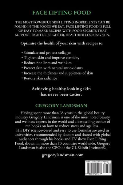 YOU CAN TRANSFORM YOUR SKIN AT ANY AGE... DID YOU KNOW YOU CAN HELP GIVE YOURSELF A NUTRITIONAL FACELIFT, REDUCE WRINKLES AND GET A HEALTHY GLOW WITH THE RIGHT FOODS? * Did you know that you can revive skin health and vitality with food? * Did you know that some everyday foods can reverse skin dryness and minimise fine lines? * Did you know that the skin's building block, collagen, can't be absorbed through a cream, but can be produced with powerful anti-aging ingredients in foods? Gregory Landsman's book, Face Food shows you how you can counteract skin dryness; reduce fine lines and wrinkles; increase collagen and elastin production; flush your face with vitality; change the quality and texture of your skin; and increase firmness with the power of anti-aging foods. THE MOST POWERFUL ANTI-AGING AND SKIN STRENGTHENING INGREDIENTS CAN BE FOUND IN THE FOODS WE EAT With the right foods you can achieve healthier looking skin at any age by supporting the body's natural ability to reduce cortisol and eliminate and neutralise toxins, which ensures optimal skin functioning and collagen production - the foundation of healthy, radiant looking skin. LEARN HOW TO USE FOOD TO DETOX AND GET HEALTHIER SKIN AT ANY AGE... Optimise the health of your skin with recipes to: * Counteract premature skin aging * Stimulate and protect collagen * Stimulate hyaluronic acid and plump out fine lines * Firm skin and improve elasticity * Reduce fine lines and wrinkles * Protect skin with natural antioxidants * Increase the thickness and suppleness of skin * Counteract age spots * Restore skin radiance and hydrate your skin from the inside out DISCOVER 101+ SKIN LIFTING FOOD SECRETS TO CREATE YOUR OWN SKIN ENHANCING AND CORTISOL LOWERING RECIPES Knowledge is power. This easy to read book delivers big skin results. The skin boosting shopping list shows you where to find more than 101 everyday food secrets to keep your skin looking its very best at any age. THE SUCCESS OF FACE FOOD BECAME A GLOBALLY ACCLAIMED TV SHOW Best selling author Gregory Landsman developed his TV sensation 'Face Lifting Food' from his best selling books FACE VALUE & FACE FOOD. The show airs in in more than eighty countries worldwide and sits on cooking channels along side Jamie Oliver, Gordon Ramsay and Master Chef USA. Face Lifting Food is shown in Universities, used in Wellness Centres, endorsed by nutritionists and recommended by doctors. WITH FACE FOOD YOU CAN TRANSFORM THE QUALITY AND TEXTURE OF YOUR SKIN AND TAKE YEARS OFF YOUR FACE NATURALLY AT ANY AGE - SHOP NOW!