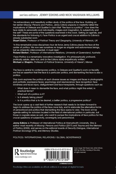 The book opens up a vast field of further research that needs to be taken forward to begin to address the politics of the face more fully, and to elaborate the alternative forms of personhood and politics that dismantling the face opens to view. The book will be agenda-setting for scholars located in the field of international politics in particular but cognate areas as well who want to pursue the implications of face politics for the crucial questions of subjectivity, sovereignty and personhood.