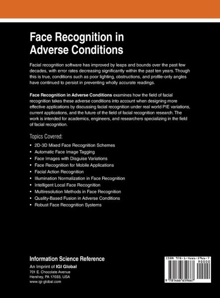 Facial recognition software has improved by leaps and bounds over the past few decades, with error rates decreasing significantly within the past ten years. Though this is true, conditions such as poor lighting, obstructions, and profile-only angles have continued to persist in preventing wholly accurate readings. Face Recognition in Adverse Conditions examines how the field of facial recognition takes these adverse conditions into account when designing more effective applications by discussing facial recognition under real world PIE variations, current applications, and the future of the field of facial recognition research. The work is intended for academics, engineers, and researchers specializing in the field of facial recognition.
