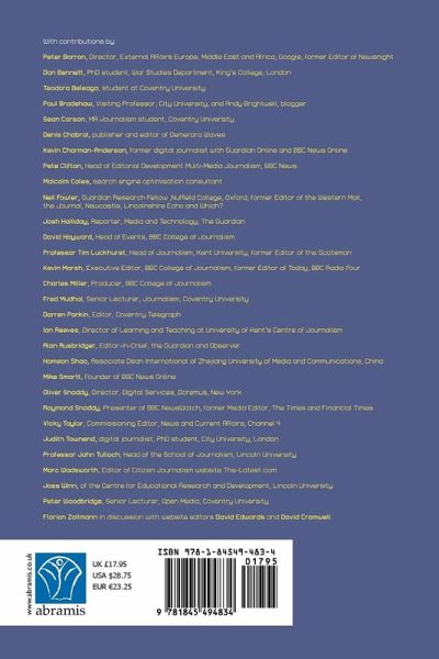With contributions by: Peter Barron, Director, External Affairs Europe, Middle East and Africa, Google, former Editor of Newsnight Dan Bennett, PhD student, War Studies Department, King's College, London Teodora Beleaga, student at Coventry University Paul Bradshaw, Visiting Professor, City University, and Andy Brightwell, blogger Sean Carson, MA Journalism student, Coventry University Denis Chabrol, publisher and editor of Demerara Waves Kevin Charman-Anderson, former digital journalist with Guardian Online and BBC News Online Pete Clifton, Head of Editorial Development Multi-Media Journalism, BBC News Malcolm Coles, search engine optimisation consultant Neil Fowler, Guardian Research Fellow ,Nuffield College, Oxford, former Editor of the Western Mail, the Journal, Newcastle, Lincolnshire Echo and Which? Josh Halliday, Reporter, Media and Technology, The Guardian David Hayward, Head of Events, BBC College of Journalism Professor Tim Luckhurst, Head of Journalism, Kent University, former Editor of the Scotsman Kevin Marsh, Executive Editor, BBC College of Journalism, former Editor of Today, BBC Radio Four Charles Miller, Producer, BBC College of Journalism Fred Mudhai, Senior Lecturer, Journalism, Coventry University Darren Parkin, Editor, Coventry Telegraph Ian Reeves, Director of Learning and Teaching at University of Kent's Centre of Journalism Alan Rusbridger, Editor-in-Chief, the Guardian and Observer Homson Shao, Associate Dean International of Zhejiang University of Media and Communications, China Mike Smartt, Founder of BBC News Online Oliver Snoddy, Director, Digital Services, Doremus, New York Raymond Snoddy, Presenter of BBC NewsWatch, former Media Editor, The Times and Financial Times Vicky Taylor, Commissioning Editor, News and Current Affairs, Channel 4 Judith Townend, digital journalist, PhD student, City University, London Professor John Tulloch, Head of the School of Journalism, Lincoln University Marc Wadsworth, Editor of Citizen Journalism website The-Latest.com Joss Winn, of the Centre for Educational Research and Development, Lincoln University Peter Woodbridge, Senior Lecturer, Open Media, Coventry University Florian Zollmann in discussion with website editors David Edwards and David Cromwell