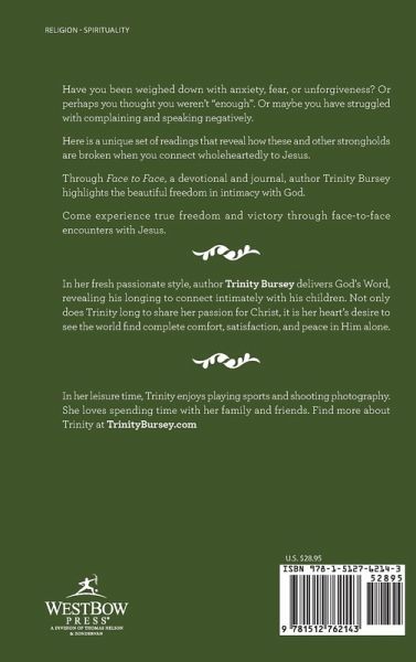 Have you been weighed down with anxiety, fear, or unforgiveness? Or perhaps you thought you weren't "enough". Or maybe you have struggled with complaining and speaking negatively. Here is a unique set of readings that reveal how these and other strongholds are broken when you connect wholeheartedly to Jesus. Through Face to Face, a devotional and journal, author Trinity Bursey highlights the beautiful freedom in intimacy with God. Come experience true freedom and victory through face-to-face encounters with Jesus.