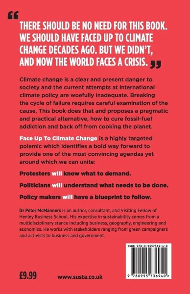 This book is a call for action to face up to climate change. McManners argues that that there is a way out of the world's climate emergency which needs much greater realism than the United Nations Framework Convention on Climate Change (UNFCCC). The changing climate is leading to record temperatures and increasing frequency of storms, but this is just the commencement of dangerous consequences to come. It has become abundantly clear that a bold approach is needed to pull back from catastrophe. People like Greta Thunberg should be admired for speaking up, and we should understand why organisations such as Extinction Rebellion exist. However, protest without a clear agenda for change has little lasting impact. The case for action is overwhelming, argued eloquently by David Attenborough and other environmentalists. The world's response must be real action, not empty promises. This book provides the manifesto that protesters and environmentalists need. It states clearly the need to close down fossil fuel without delay. Individuals making change within their own lives will make little difference. The solution is to demand even bigger changes which apply to all. Read this book. Support the manifesto. Face Up to Climate Change NOW.