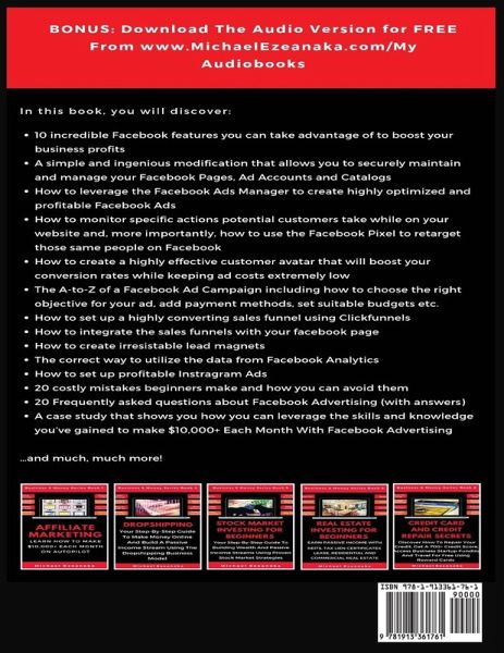 The Only Guide You Need To Advertise Profitably On Facebook - Even If You're Completely Clueless! Would you like to discover how to set up highly profitable systems that will ensure your business never runs out of customers? Would you like to discover how to lazer target your ideal customers on Facebook and acquire them very cheaply? Would you like to discover how to use your new found knowledge to earn as much as $53,500 in profit? ...If you answered yes to the above questions, then you NEED this book. "I was a bit skeptical at first when I bought this book but wow! This really is an amazing book. I found it super easy to follow and everything was explained in clear layman’s terms. There is a wealth of information including analytics on how to narrow your target audience to just the people who are interested in your product/services. With the information here, I’m confident i can get on Facebook and start generating Revenue for the product that I sell." - Amazon Customer In this book, you'll discover: 10 incredible Facebook features you can take advantage of to boost your business profits A simple and ingenious modification that allows you to securely maintain and manage your Facebook Pages, Ad Accounts and Catalogs How to leverage the Facebook Ads Manager to create highly optimized and profitable Facebook Ads How to monitor specific actions potential customers take while on your website and, more importantly, how to use the Facebook Pixel to retarget those same people on Facebook How to create a highly effective customer avatar that will boost your conversion rates while keeping ad costs extremely low The A-to-Z of a Facebook Ad Campaign including how to choose the right objective for your ad, add payment methods, set suitable budgets etc. How to set up a highly converting sales funnel using Clickfunnels How to integrate the sales funnels with your facebook page How to create irresistable lead magnets The correct way to utilize the data from Facebook Analytics How to set up profitable Instragram Ads 20 costly mistakes beginners make and how you can avoid them 20 Frequently asked questions about Facebook Advertising (with answers) A case study that shows you how you can leverage the skills and knowledge you’ve gained to make as much as $53,500 in profit from clients ...and much, much more! If you're ready to tackle the above questions, I'm ready, get your copy of this book and lets get started!