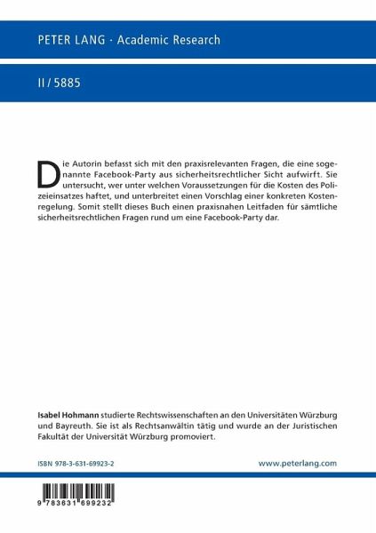 Die Autorin befasst sich mit den praxisrelevanten Fragen, die eine sogenannte Facebook-Party aus sicherheitsrechtlicher Sicht aufwirft. Sie untersucht, wer unter welchen Voraussetzungen für die Kosten des Polizeieinsatzes haftet, und unterbreitet einen Vorschlag einer konkreten Kostenregelung. Somit stellt dieses Buch einen praxisnahen Leitfaden für sämtliche sicherheitsrechtlichen Fragen rund um eine Facebook-Party dar.