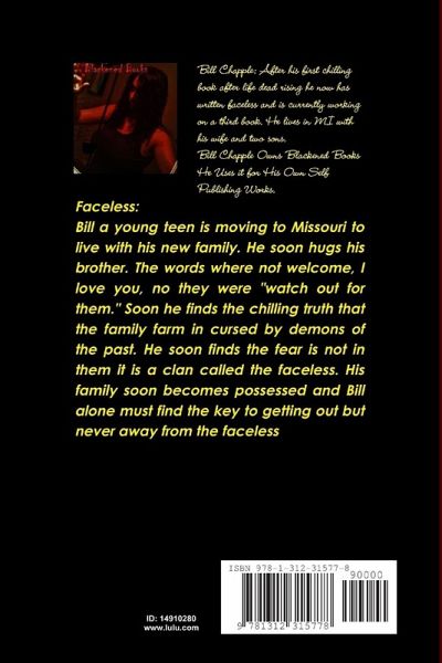Faceless: Bill a young teen is moving to Missouri to live with his new family. He soon hugs his brother. The words where not welcome, I love you, no they were "watch out for them." Soon he finds the chilling truth that the family farm in cursed by demons of the past. He soon finds the fear is not in them it is a clan called the faceless. His family soon becomes possessed and Bill alone must find the key to getting out but never away from the faceless