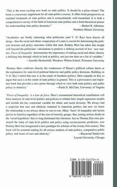 The controversial new thesis of Faces of Inequality is that a state's racial and ethnic composition, more than any other factor, directs its political processes and policies. Social diversity is therefore central to any understanding of state political cultures. Overturning long-established conventional wisdom, Rodney Hero has developed a completely new lens through which to view American politics.