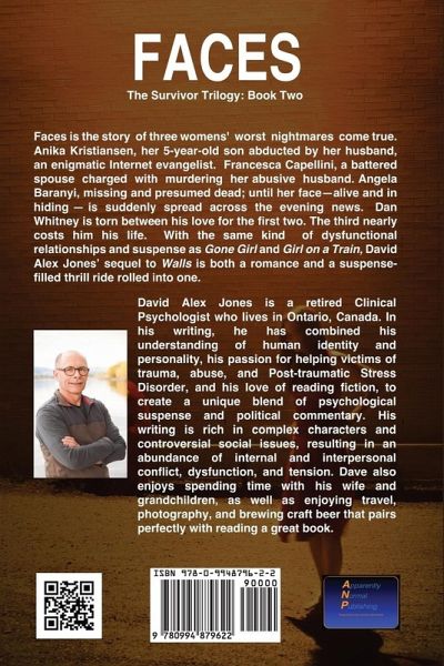 Faces: The Survivor Trilogy, Book TwoPsychologist Dan Whitney, still reeling from the devastating trauma of the events in David Alex Jones' first novel, Walls, comes to the aid of his long time friend, Anika Kristiansen, who is experiencing a parent's worst nightmare come true - the abduction of her five-year-old son Jonah. Even more shocking is the fact that Jonah has been abducted by Anika's husband, Pastor Soren Kristiansen, the enigmatic leader of the world's most popular online church.At the same time, Dan and Francesca Capellini struggle to define their new love in the aftermath of the erotic and tragic event of Walls. Just when they think they may have a future together, Dan finds his old feelings for Anika resurfacing, while Fran finds herself facing murder charges in the death of her husband, Philippe. What should be an open and shut case of Battered Spouse Syndrome, becomes a legal nightmare for Francesca. Even worse, Jonah's abduction and Fran's case both become the tip of a much larger global conspiracy involving Pastor Soren and a cast of mystery characters - each of them living double lives and hiding their true faces and identities.Faces is the story of the main character's inner struggles to define their identities. It is a complex web of Dan and Anika's desperate race against time to find Jonah, while Dan, Anika, and Fran try to resolve their love triangle. With the same kind of dysfunctional relationships and suspense as Girl on a Train and Gone Girl, all set within the context of an emerging global conspiracy, Faces is both a romance and a suspense-filled roller coaster thrill ride.Together with Walls, the first book of David Alex Jones' Survivor Trilogy, Faces is a sequel that will leave readers clamoring for the final book in this thrilling series.