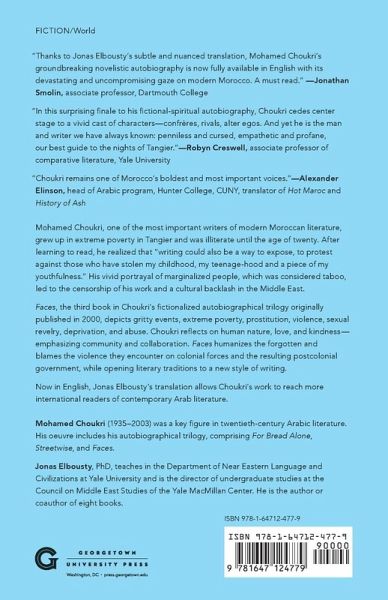 The first English translation of one of the novels that helped change modern Arab literature Mohamed Choukri, one of the most important writers of modern Moroccan literature, grew up in extreme poverty in Tangier and was illiterate until the age of twenty. After learning to read, he realized that "writing could also be a way to expose, to protest against those who have stolen my childhood, my teenage-hood and a piece of my youthfulness." His vivid portrayals of marginalized people, which had been considered taboo, led to the censorship of his work and a cultural backlash in the Middle East. In Faces, the third book in his trilogy of fictionalized autobiographical works, he describes gritty events, extreme poverty, prostitution, violence, sexual revelry, deprivation, and abuse. It is through his storytelling that Choukri reflects on human nature, love, and kindness-emphasizing the need for community and collaboration. Faces humanizes those undergoing poverty and places the blame for the violence they encounter squarely on colonial forces and the resulting postcolonial government, while opening literary traditions to a new style of writing. Choukri's friendships with Tennessee Williams, Paul Bowles, Jean Genet, and other writers brought him attention in his lifetime. But Faces-his last novel, which was originally published in Arabic in 2000--has remained untranslated until now. In English for the first time, Jonas Elbousty's translation allows Choukri's work to reach wider international discussions of contemporary Arab literature.