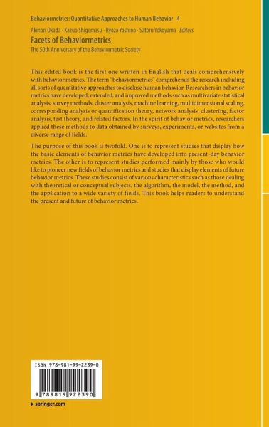 This edited book is the first one written in English that deals comprehensively with behavior metrics. The term "behaviormetrics" comprehends the research including all sorts of quantitative approaches to disclose human behavior. Researchers in behavior metrics have developed, extended, and improved methods such as multivariate statistical analysis, survey methods, cluster analysis, machine learning, multidimensional scaling, corresponding analysis or quantification theory, network analysis, clustering, factor analysis, test theory, and related factors. In the spirit of behavior metrics, researchers applied these methods to data obtained by surveys, experiments, or websites from a diverse range of fields.