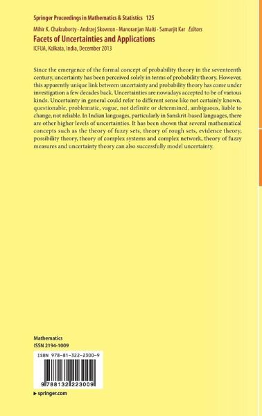 Part I: Uncertainty Modeling.- Chapter 1. Rough Sets and other Mathematics: Ten Research Programs.- Chapter 2. Dealing with Uncertainty: From Rough Sets to Interactive Rough-Granular Computing.- Chapter 3. An Evolutionary Approach to Secondary Membership Function Selection in Generalized Type- 2 Fuzzy Sets.- Chapter 4. Specificity based defuzzification in approximate reasoning.- Chapter 5. Proto-fuzzy Concepts Generation Technique Using Fuzzy Graph.- Part II: Logic of Uncertainty .- Chapter 6. Open World Models: a View from Rough Set Theory.- Chapter 7. Approximate reasoning under type-2 fuzzy logics.- Chapter 8. Approximation Dialectics of Proto-Transitive Rough Sets.- Part III: Hybridization of Uncertainties .- Chapter 9. A Probabilistic Approach to Information System and Rough Set Theory.- Chapter 10. Uncertainty Analysis of Contaminant Transportation Through Ground Water Using Fuzzy-Stochastic Response Surface.- Chapter 11. Development of a Fuzzy Random Health Risk Model.- Chapter 12. Uncertainty Analysis of Retardation factor using Monte Carlo, Fuzzy set and Hybrid Approach.- Part IV: Roll of Uncertainties .- Chapter 13. Two Person Interaction Detection Using Kinect Sensor.- Chapter 14. An Improved Genetic Algorithm and Its Application in Constrained Solid TSP in Uncertain Environments.- Chapter 15. A Novel Soft theoretic AHP Model for Project Management in Multi-Criteria Decision Making Problem.- Chapter 16. An Application of Weighted Neutrosophic Soft Sets in a Decision Making Problem.- Chapter 17. Approximate Reasoning in Management of Hypertension.- Chapter 18. The Hesitant Fuzzy Soft Set and its Application in Decision Making.- Chapter 19. On Fuzzy Ideal Cone Method to Capture Entire Fuzzy Non-dominated Set of Fuzzy Multi-criteria Optimization Problems with Fuzzy Parameters.- Chapter 20. A Bi-Objective Solid Transportation Model under Uncertain Environment.- Chapter 21. A Food web Population Model in Deterministic and Stochastic Environment.- Chapter 22. Computational Method for High-order Weighted Fuzzy Time Series Forecasting Based on Multiple Partitions.- Chapter 23. Portfolio Selection with Possibilistic Kurtosis.- Chapter 24. Conflicting Bifuzzy Preference Relations based Method for Multi Criteria Decision Making Problems.- Chapter 25. A Linear Goal Programming Method for Solving Chance Constrained Multi objective Problems with Interval Data Uncertainty.