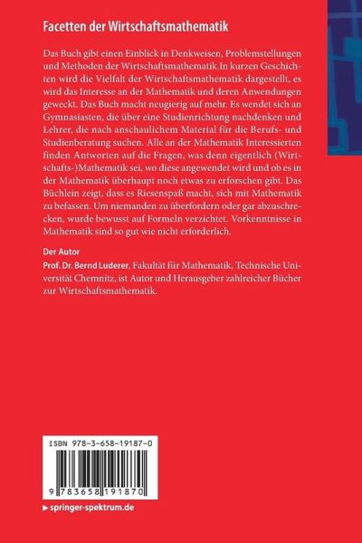 Das Buch gibt einen Einblick in Denkweisen, Problemstellungen und Methoden der Wirtschaftsmathematik.In kurzen Geschichten wird die Vielfalt der Wirtschaftsmathematik dargestellt, es wird das Interesse an der Mathematik und deren Anwendungen geweckt. Das Buch macht neugierig auf mehr. Es wendet sich an Gymnasiasten, die über eine Studienrichtung nachdenken und Lehrer, die nach anschaulichem Material für die Berufs- und Studienberatung suchen. Alle an der Mathematik Interessierten finden Antworten auf die Fragen, was denn eigentlich (Wirtschafts-)Mathematik sei, wo diese angewendet wird und ob es in der Mathematik überhaupt noch etwas zu erforschen gibt. Das Büchlein zeigt, dass es Riesenspaß macht, sich mit Mathematik zu befassen. Um niemanden zu überfordern oder gar abzuschrecken, wurde bewusst auf Formeln verzichtet. Vorkenntnisse in Mathematik sind so gut wie nicht erforderlich.