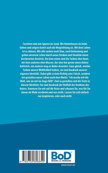 Facetten sind wie Spuren im Sand. Wir hinterlassen sie beim Gehen und zeigen damit auch die Wegrichtung an. Mit dem Leben ist es ebenso. Wir alle suchen nach Sinn, nach Bedeutung und geben unserem Leben durch unser Denken und Handeln einen bestimmten Anstrich. Bei dem einen sind die Farben eher bunt, bei dem anderen eher blasser, der eine hat gerne einen dicken Aufstrich, ein anderer mag es lieber dezenter. Ganz gleich, welche Farben unsere Wirklichkeit haben, sie sind Ausdruck unserer eigenen Identität. Dabei gibt es kein Richtig oder Falsch, sondern wir gestalten unser Leben nach dem Motto: "ich mache mit die Welt, wie sie mir ins Auge fällt". Und so gestalten sich die Texte in diesem Büchlein: Sie sind Ausdruck der Vielfalt des Denkens des Autors. Kommen Sie mit auf die Reise und schauen Sie, was für Sie davon als Wahr erscheint und was nicht. Lassen Sie sich einfach nur inspirieren, oder auch nicht.