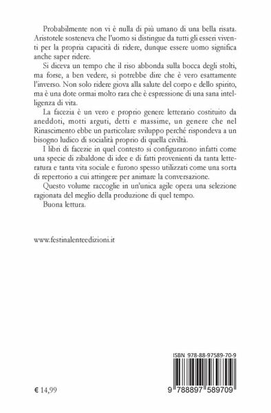 Probabilmente non vi è nulla di più umano del riso. Aristotele sosteneva che l'uomo si distingue da tutti gli esseri viventi per la propria capacità di ridere, dunque essere uomo significa anche saper ridere. Si diceva un tempo che il riso abbonda sulla bocca degli stolti, ma forse, a ben vedere, si potrebbe dire che è vero esattamente l'inverso. Non solo ridere giova alla salute del corpo e dello spirito, ma è una dote ormai molto rara che è espressione di una sana intelligenza di vita. La facezia è un vero e proprio genere letterario costituito da aneddoti, motti arguti, detti e massime, un genere che nel Rinascimento ebbe un particolare sviluppo perché rispondeva a un bisogno ludico di socialità proprio di quella civiltà. I libri di facezie in quel contesto si configurarono infatti come una specie di zibaldone di idee e di fatti provenienti da tanta letteratura e tanta vita sociale e furono spesso utilizzati come una sorta di repertorio a cui attingere per animare la conversazione. Il libro raccoglie, in un'unica agile opera, una selezione ragionata del meglio della produzione di quel tempo.