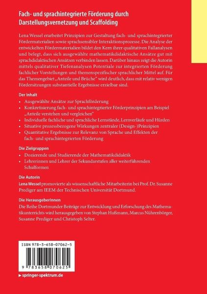 Lena Wessel erarbeitet Prinzipien zur Gestaltung fach- und sprachintegrierter Fördermaterialien sowie sprachsensibler Interaktionsprozesse. Die Analyse der entwickelten Fördermaterialien bildet den Kern ihrer qualitativen Fallanalysen und belegt, dass sich ausgewählte mathematikdidaktische Ansätze gut mit sprachdidaktischen Ansätzen verbinden lassen. Darüber hinaus zeigt die Autorin mittels qualitativer Tiefenanalysen Potentiale zur integrierten Förderung fachlicher Vorstellungen und themenspezifischer sprachlicher Mittel auf. Für das Themengebiet "Anteile und Brüche" wird deutlich, dass mit relativ wenigen Fördersitzungen substantielle Ergebnisse erzielbar sind.