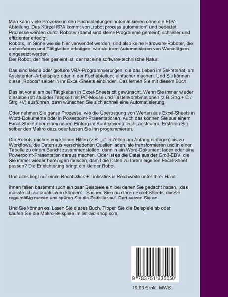 Zusammenfassung: Information zum TitelDas Kürzel RPA kommt von robot process automation und bedeutet, viele Prozesse werden durch Roboter (damit sind kleine Programme gemeint) schneller und effizienter erledigt als in manuellen Prozessen.In Excel sind das kleine oder größere VBA-Programmierungen, die das Leben im Sekretariat oder am Assistenten-Arbeitsplatz oder in einer Fachabteilung einfacher machen.Wahrscheinlich haben auch Sie das eine oder andere Excel-Sheet erstellt, an dem zur Perfektion nur noch ein paar kleine Hilfsmakros fehlen, die seine Bedienung, die Zuverlässigkeit der Eingabe etc. perfekter machen würden.Genau für diese Fälle sind die Beispiele.Sie sollen ein schnelles Erfolgserlebnis verschaffen und Sie dazu anleiten, selber nach kleinen Verbesserungen zu suchen.Viele (kleine oder größere) Makros finden Sie im Internet kostenlos.Da besteht für die praktische Einbindung in die tägliche Arbeit mit Ihrem Excel-Sheet aber die Hürde, wo platzieren Sie einen Button odermit welcher Tastenkombination sollen die Makros aufgerufen werden, wenn sie in ein Modul Ihrer Exceldatei kopiert sind.Hier wollen wir Ihnen zeigen, wie Sie das Excel-Kontextmenü aufbauen, um genau diese kleinen Helfer im Hintergrund zu verstecken und doch leicht aufrufbar zu machen.Das Kontextmenü ist dazu ideal geeignet. Es startet beim Datei-Aufruf, es löscht sich selbst, wenn Sie die Datei schliessen. Auch das zeigen wir. Sie können es selber so einrichten.Sie können Ihr Menü erweitern, je nachdem was Sie selber mit dem Makrorekorder aufzeichnen oder was Sie im Internet an fertigen Programmen (Makros) finden. Beispielcode abtippen und loslegen.