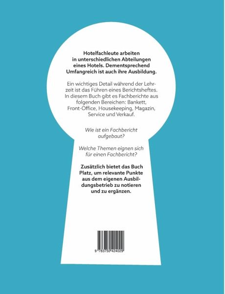 Fachberichte für Azubis im HotelfachHotelfachleute arbeiten in unterschiedlichen Abteilungen eines Hotels. Dementsprechend Umfangreich ist auch ihre Ausbildung. Ein wichtiges Detail während der Lehrzeit ist das Führen eines Berichtsheftes. In diesem Buch gibt es Fachberichte aus folgenden Bereichen; Bankett, Front-Office, Housekeeping, Magazin, Service und Verkauf.Wie ist ein Fachbericht aufgebaut?Welche Themen eignen sich für einen Fachbericht?Zusätzlich bietet das Buch Platz um relevante Punkte aus dem eigenen Ausbildungsbetrieb zu notieren und zu ergänzen.