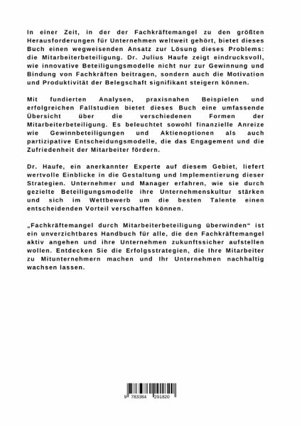 In einer Zeit, in der der Fachkräftemangel zu den größten Herausforderungen für Unternehmen weltweit gehört, bietet dieses Buch einen wegweisenden Ansatz zur Lösung dieses Problems: die Mitarbeiterbeteiligung. Dr. Julius Haufe zeigt eindrucksvoll, wie innovative Beteiligungsmodelle nicht nur zur Gewinnung und Bindung von Fachkräften beitragen, sondern auch die Motivation und Produktivität der Belegschaft signifikant steigern können.Mit fundierten Analysen, praxisnahen Beispielen und erfolgreichen Fallstudien bietet dieses Buch eine umfassende Übersicht über die verschiedenen Formen der Mitarbeiterbeteiligung. Es beleuchtet sowohl finanzielle Anreize wie Gewinnbeteiligungen und Aktienoptionen als auch partizipative Entscheidungsmodelle, die das Engagement und die Zufriedenheit der Mitarbeiter fördern.Dr. Haufe, ein anerkannter Experte auf diesem Gebiet, liefert wertvolle Einblicke in die Gestaltung und Implementierung dieser Strategien. Unternehmer und Manager erfahren, wie sie durch gezielte Beteiligungsmodelle ihre Unternehmenskultur stärken und sich im Wettbewerb um die besten Talente einen entscheidenden Vorteil verschaffen können."Fachkräftemangel durch Mitarbeiterbeteiligung überwinden" ist ein unverzichtbares Handbuch für alle, die den Fachkräftemangel aktiv angehen und ihre Unternehmen zukunftssicher aufstellen wollen. Entdecken Sie die Erfolgsstrategien, die Ihre Mitarbeiter zu Mitunternehmern machen und Ihr Unternehmen nachhaltig wachsen lassen.