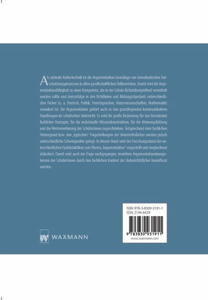 Als zentrale Kulturtechnik ist die Argumentation Grundlage von demokratischen Entscheidungsprozessen in allen gesellschaftlichen Teilbereichen. Damit wird die Argumentationsfähigkeit zu einer Kompetenz, die in der Schule fächerübergreifend vermittelt werden sollte und demzufolge in den Richtlinien und Bildungsstandards unterschiedlicher Fächer (u. a. Deutsch, Politik, Fremdsprachen, Naturwissenschaften, Mathematik) verankert ist. Die Argumentation gehört auch zu den grundlegenden kommunikativen Handlungen im schulischen Unterricht. Es wird ihr große Bedeutung für das Verständnis fachlicher Konzepte, für die individuelle Wissenskonstruktion, für die Meinungsbildung und die Wertorientierung der SchülerInnen zugeschrieben. Entsprechend dem fachlichen Hintergrund bzw. den "typischen" Fragestellungen der Unterrichtsfächer werden jedoch unterschiedliche Schwerpunkte gelegt. In diesem Band wird der Forschungsstand der unterschiedlichen Fachdidaktiken zum Thema "Argumentation" vorgestellt und vergleichend diskutiert. Damit wird auch der Frage nachgegangen, inwiefern Argumentationskompetenzen der SchülerInnen durch den fachlichen Kontext der Unterrichtsfächer beeinflusst werden.