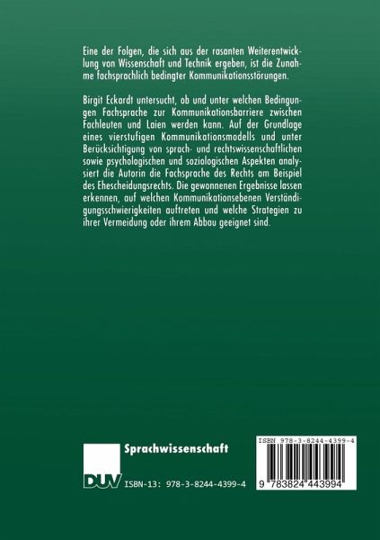 Eine der Folgen, die sich aus der rasanten Weiterentwicklung von Wissenschaft und Technik ergeben, ist die Zunahme fachsprachlich bedingter Kommunikationsstörungen. Birgit Eckardt untersucht, ob und unter welchen Bedingungen Fachsprache zur Kommunikationsbarriere zwischen Fachleuten und Laien werden kann. Auf der Grundlage eines vierstufigen Kommunikationsmodells und unter Berücksichtigung von sprach- und rechtswissenschaftlichen sowie psychologischen und soziologischen Aspekten analysiert die Autorin die Fachsprache des Rechts am Beispiel des Ehescheidungsrechts. Die gewonnenen Ergebnisse lassen erkennen, auf welchen Kommunikationsebenen Verständigungsschwierigkeiten auftreten und welche Strategien zu ihrer Vermeidung oder ihrem Abbau geeignet sind.
