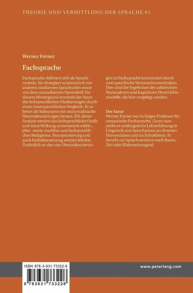 Fachsprache definiert sich als Sprachvarietät: Sie divergiert systematisch von anderen markierten Sprachstilen sowie von dem unmarkierten Neutralstil. Vor diesem Hintergrund ermittelt der Autor die fachsprachlichen Markierungen durch einen innersprachlichen Vergleich. Er arbeitet als Subsystem vier textsyntaktische Umstrukturierungen heraus. Mit dieser Analyse werden das fachsprachliche Outfit und seine Wirkung systematisch erklär-, plan- sowie machbar und fachsprachliches Redigieren, Textoptimierung und auch Fachübersetzung werden lehrbar. Zusätzlich zu den vier Umstrukturierungen ist Fachsprache konstituiert durch zwei spezifische Nominationstechniken. Dies sind die Ergebnisse der zahlreichen Textanalysen und kognitiven Unterrichtsmodelle, die hier vorgelegt werden.