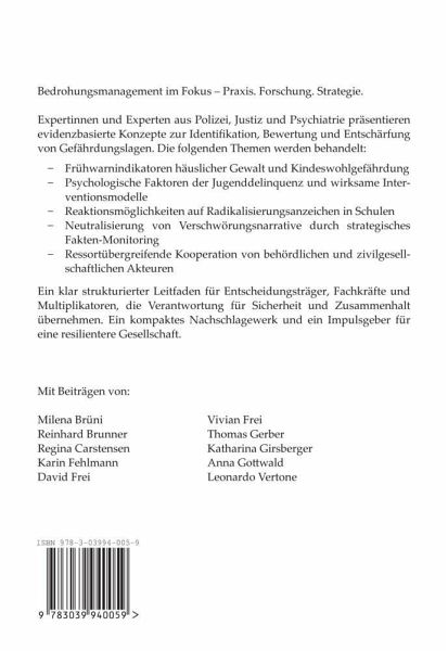 Bedrohungsmanagement im Fokus - Praxis. Forschung. Strategie.Expertinnen und Experten aus Polizei, Justiz und Psychiatrie präsentieren evidenzbasierte Konzepte zur Identifikation, Bewertung und Entschärfung von Gefährdungslagen. Die folgenden Themen werden behandelt:- Frühwarnindikatoren häuslicher Gewalt und Kindeswohlgefährdung- Psychologische Faktoren der Jugenddelinquenz und wirksame Interventionsmodelle- Reaktionsmöglichkeiten auf Radikalisierungsanzeichen in Schulen- Neutralisierung von Verschwörungsnarrative durch strategisches Fakten-Monitoring- Ressortübergreifende Kooperation von behördlichen und zivilgesellschaftlichen AkteurenEin klar strukturierter Leitfaden für Entscheidungsträger, Fachkräfte und Multiplikatoren, die Verantwortung für Sicherheit und Zusammenhalt übernehmen. Ein kompaktes Nachschlagewerk und ein Impulsgeber für eine resilientere Gesellschaft.