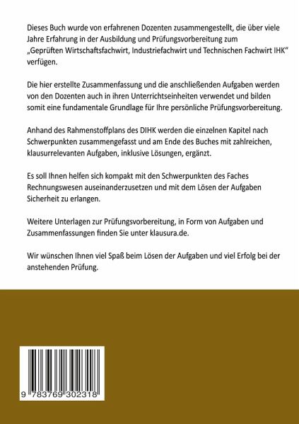 Dieses Buch wurde von erfahrenen Dozenten zusammengestellt, die über viele Jahre Erfahrung in der Ausbildung und Prüfungsvorbereitung zum Geprüften Wirtschaftsfachwirt, Industriefachwirt und Technischen Fachwirt IHK verfügen. Die hier erstellte Zusammenfassung und die anschließenden Aufgaben werden von den Dozenten auch in ihren Unterrichtseinheiten verwendet und bilden somit eine fundamentale Grundlage für Ihre persönliche Prüfungsvorbereitung. Anhand des Rahmenstoffplans des DIHK werden die einzelnen Kapitel nach Schwerpunkten zusammengefasst und am Ende des Buches mit zahlreichen, klausurrelevanten Aufgaben, inklusive Lösungen, ergänzt. Es soll Ihnen helfen, sich kompakt mit den Schwerpunkten des Faches Rechnungswesen auseinanderzusetzen und mit dem Lösen der Aufgaben Sicherheit zu erlangen. Weitere Unterlagen zur Prüfungsvorbereitung, in Form von Aufgaben und Zusammenfassungen finden Sie unter klausura.de. Wir wünschen Ihnen viel Spaß beim Lösen der Aufgaben und viel Erfolg bei der anstehenden Prüfung.