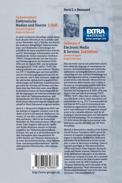 Dieses aktuelle Wörterbuch umfaßt den Bereich der Telekommu- nikations- und Multimediaanwendungen einschließlich der PC- Terminologie (Windows). Schwerpunkte sind Digitales Fernse- hen, Mobilfunk, Netztechnologie, insbesondere Internet, auch Standards und Begriffe des Netzmanagements. Aufgrund der vielen alphabetisch eingegliederten Abkürzungen und fachli- chen Zusatzbemerkungen sowie die Verweise auf Normen und Standards - im Anhang befinden sich Tabellen aller CCITT- Normen - dient das Werk über seine Wörterbuchfunktion hinaus als Nachschlagewerk für den Kommunikations- und Informati- onsfachmann. Die zweite Auflage wurde auf den neuesten Stand der Technik gebracht und auf fast 40000 Stichwörter erwei- tert. Die beiliegende CD-ROM enthält das gesamte Wörterbuch im Word-Format, was eine bequeme Stichwort- und Volltextsu- che sowie Textübernahme ermöglicht. This topical dictionary covers all aspects of telecommunication and multimedia applications, including personal compu- ting and Windows terms. Special emphasis is placed on digital television, radio telephony, net and Internet technology, and net management concepts and standards. Numerous abbreviations are also listed with explanatory comments and cross-references to norms and standards, and tables of all CCITT norms are given in an appendix. More than just a dictionary, this book will be an indispensible reference for all who work in telecommunications and information technology. The second edition was updated and extended to almost 40000 headwords. The accompagnying CD-ROM contains the comlete dictionary in Word format, allowing comfortable headword and full text search as well as transfer of text.