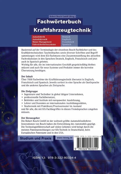Basierend auf der Terminologie der einzelnen Bosch-Fachbücher und des Kraftfahrtechnischen Taschenbuches sowie diverser Schriften und Begriffsammlungen wird dem Kfz-Fachmann eine Zusammenstellung des aktuellen Fachvokabulars in den Sprachen Deutsch, Englisch, Französisch und jetzt auch in Spanisch geboten. Wichtig für alle, die im internationalen Geschäft gesprächsfähig bleiben müssen und auch für neue Systeme und Produkte immer die korrekte Übersetzung benötigen.